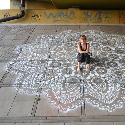 een gehaakt kantwerk patroon wordt als sjabloon geplaatst en dan met een spuitbus verf op de straatstenen of ruige betonnen wanden gespoten en zo ontstaat een interessant contrast tussen dit delicate werk en de harde stad. verwaarloosde stedelijke ruimten over de hele wereld worden zo getransformeerd en verfraait.
