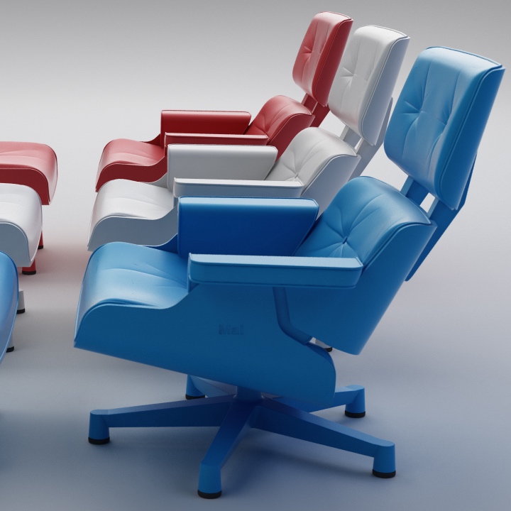 zo ook de lounge chair, nu uitgevoerd in slechts 1 materiaal en 1 kleur en verkrijgbaar in 7 ral-kleuren; oranje ral 2004, blauw ral 5015, rood ral 3020, wit ral 9010, grijs ral 7023, geel ral 1023 en groen ral 1108.