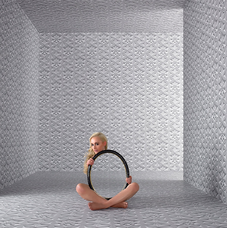 op de afbeelding hierboven de serie ‘wall flower’, bloemetjesbehang met een tromp l’oeil effect van gehouwen steen of gips, maar het is plat bij aanraking. door middel van de variëteit in oppervlaktes worden je ogen ietwat voor de gek gehouden. zo komen sommige bloemen door de driedimensionale accenten tot leven. het 2d behang is omgezet naar een spectaculaire 3d ervaring.