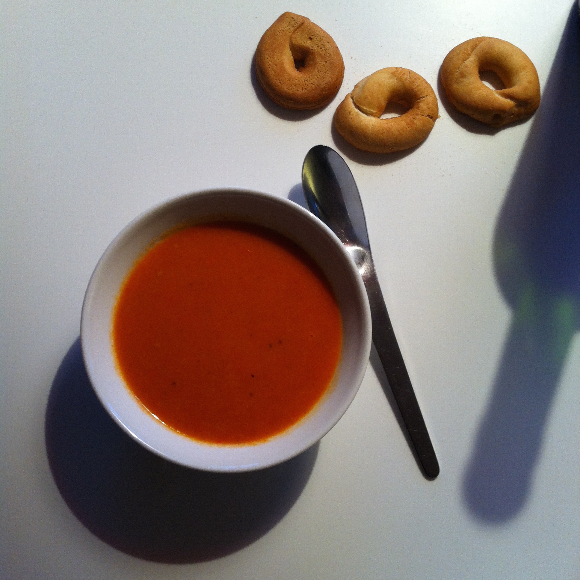 2 rode paprika’s + 500 g tomaten + 1 rode ui + halve bol knoflook + 1 groente bouillonblokje + olijfolie + zout en peper