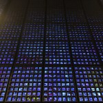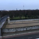 We lopen nog even binnen in de Gedächtnis Kirche met zijn overweldigende blauwe glas-in-lood ramen en ook het grote orgel. En gaan dan door naar de Bernauerstrasse waar een flink stuk van de muur is blijven staan en een monument vormt: Gedänkstatte Berliner Mauer. Naast het stuk muur van 170 meter, zijn er delen aangevuld van Cortenstaal, deels gesloten en deels open en een fotowand van de gesneuvelden, het Fenster des Gedänkes. Vanaf een uitzichtpunt hebben we uitzicht op een stukje ingesloten niemandsland met voor de muur in West en achter Oost en een oorspronkelijke wachttoren ertussen. In het Documentatiecentrum zijn uitvergrote zwart-wit foto’s te zien met mensen die over het prikkeldraad en over de muur naar elkaar zwaaien, van begin jaren 60. Ongelofelijk dat dit tot 1989 de harde werkelijkheid was… We vertrekken tegen 17.30u richting het hoofdstation voor de terugreis.