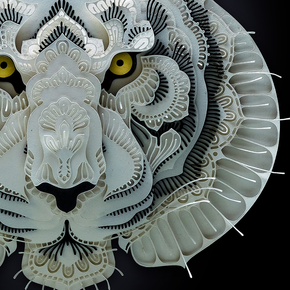 Baas-boven-baas. Dit is een detail van een tijgerkop, gemaakt van papier. Gesneden uit papier. Kunstenaar Patrick Cabral uit Manila maakt veelal portretten, Paper Cut Portraits, maar ook hele dieren gesneden uit papier. Allemaal lagen en rijk gedecoreerd [rijkelijk uitgesneden?]