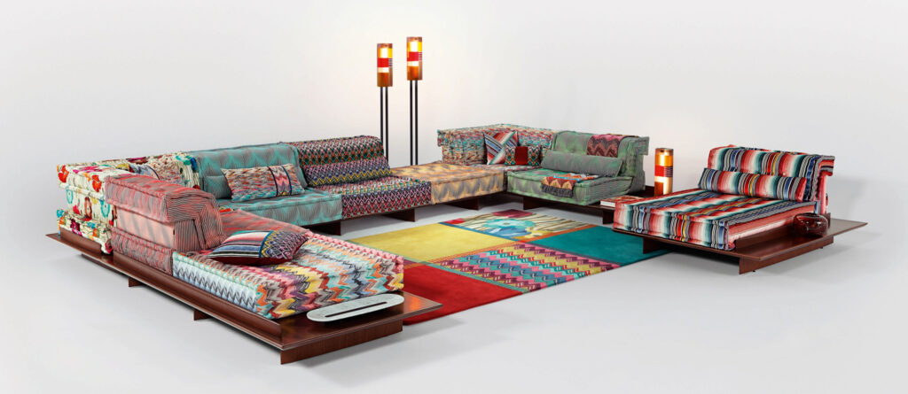 Mah Jong is een klassiek Chinees spel wat wordt gespeeld met 144 gekleurde stenen, de naam voor de modulaire banken is daarop gebaseerd. De prachtige en kleurrijke stoffen komen uit de studio’s van modemerk Kenzo [en er is een buitenvariant met kussens van modemerk Missoni]. Mooie variant op deze iconische bank en meteen een tweede klassieker.