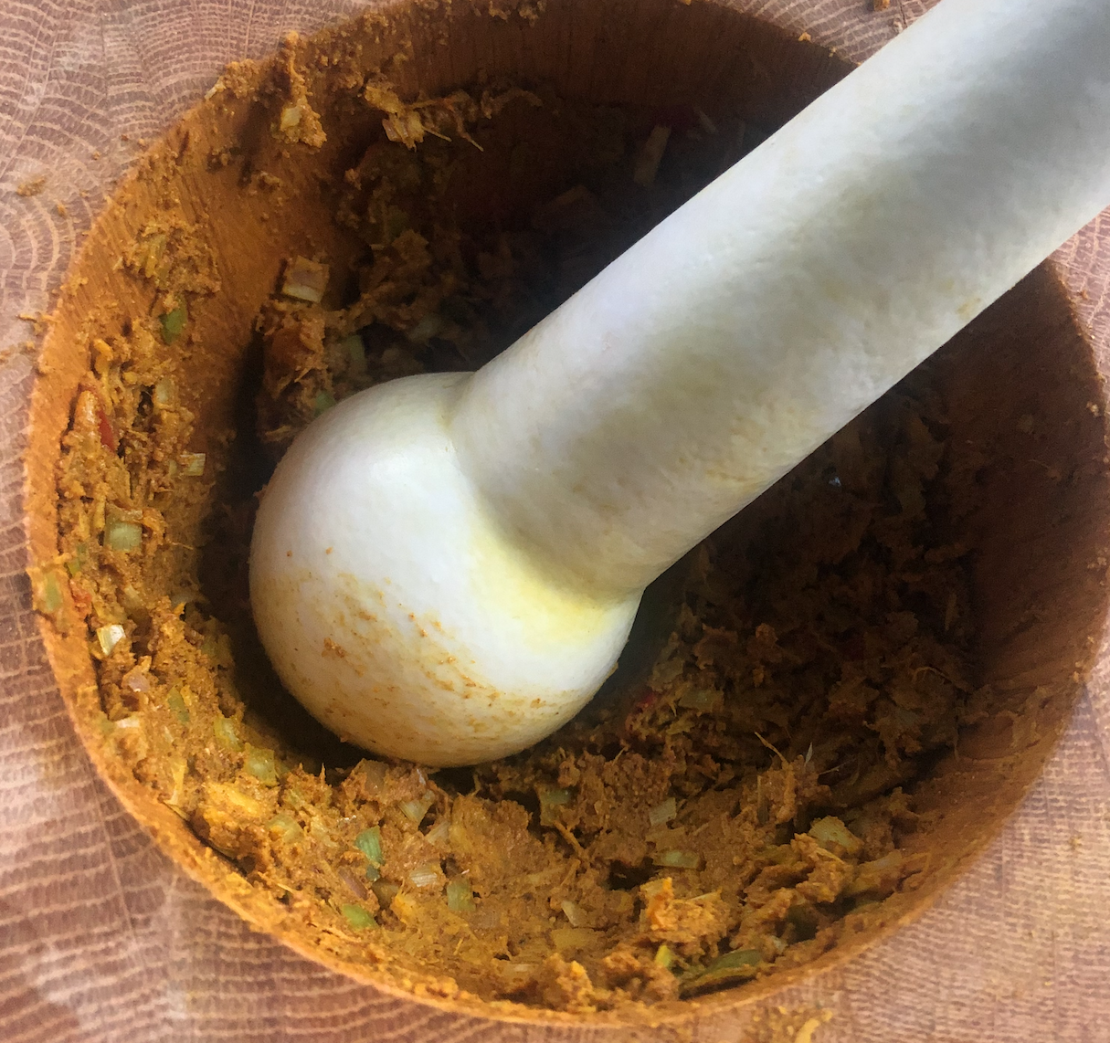 Doen: Snij de sjalotten, knoflook, peper, gember en citroengras in stukjes en voeg ze samen met alle kruiden toe aan de vijzel. Wrijf dit samen tot een mooie pasta [boemboe]. Bak de boemboe in de olie zachtjes gedurende 4-5 minuten. Rooster de kokos zachtjes in een droge koekenpan, zonder het te laten kleuren en hou dit apart.
