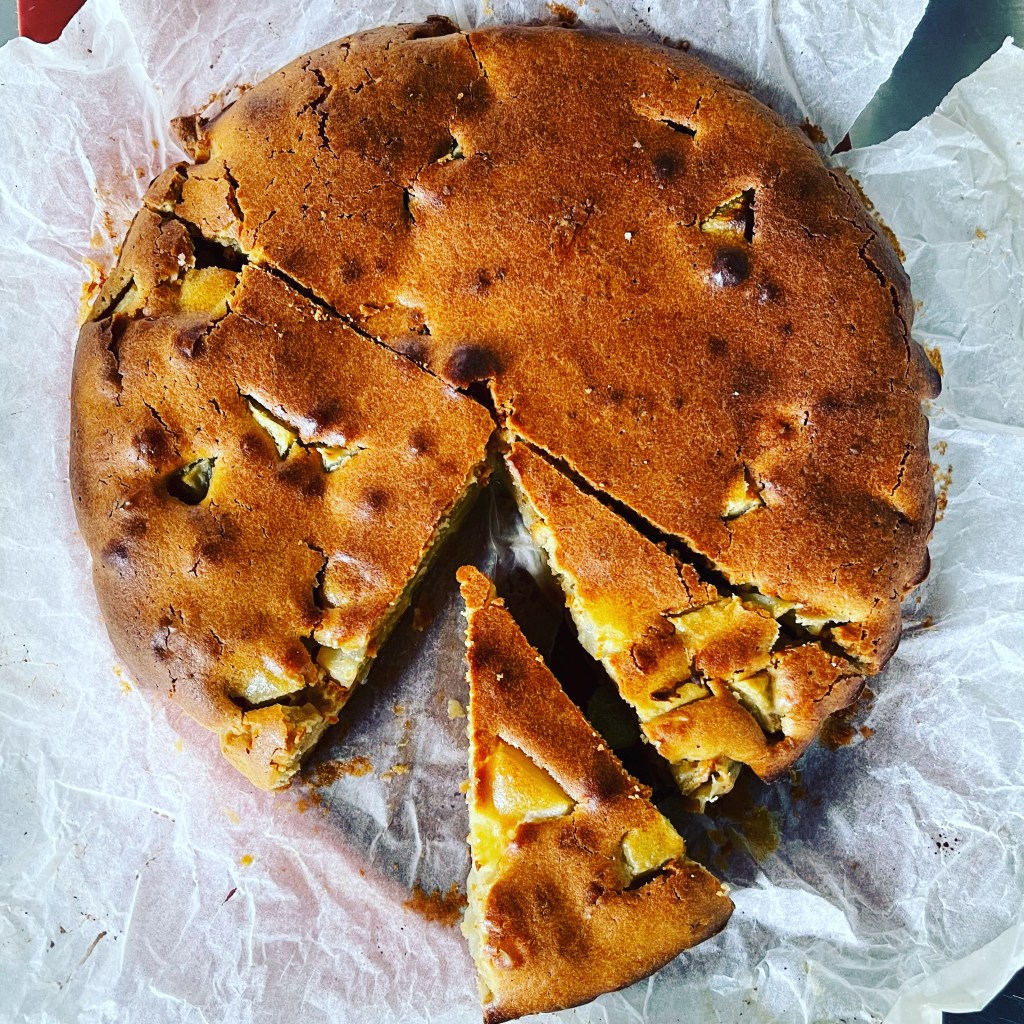En dat is niet zomaar een cake met peren, het is een Scandinavische perencake met kardemom. Die bakten wij vandaag omdat mijn moeder vandaag jarig is. We eten daarom -op afstand- graag een puntje mee…
