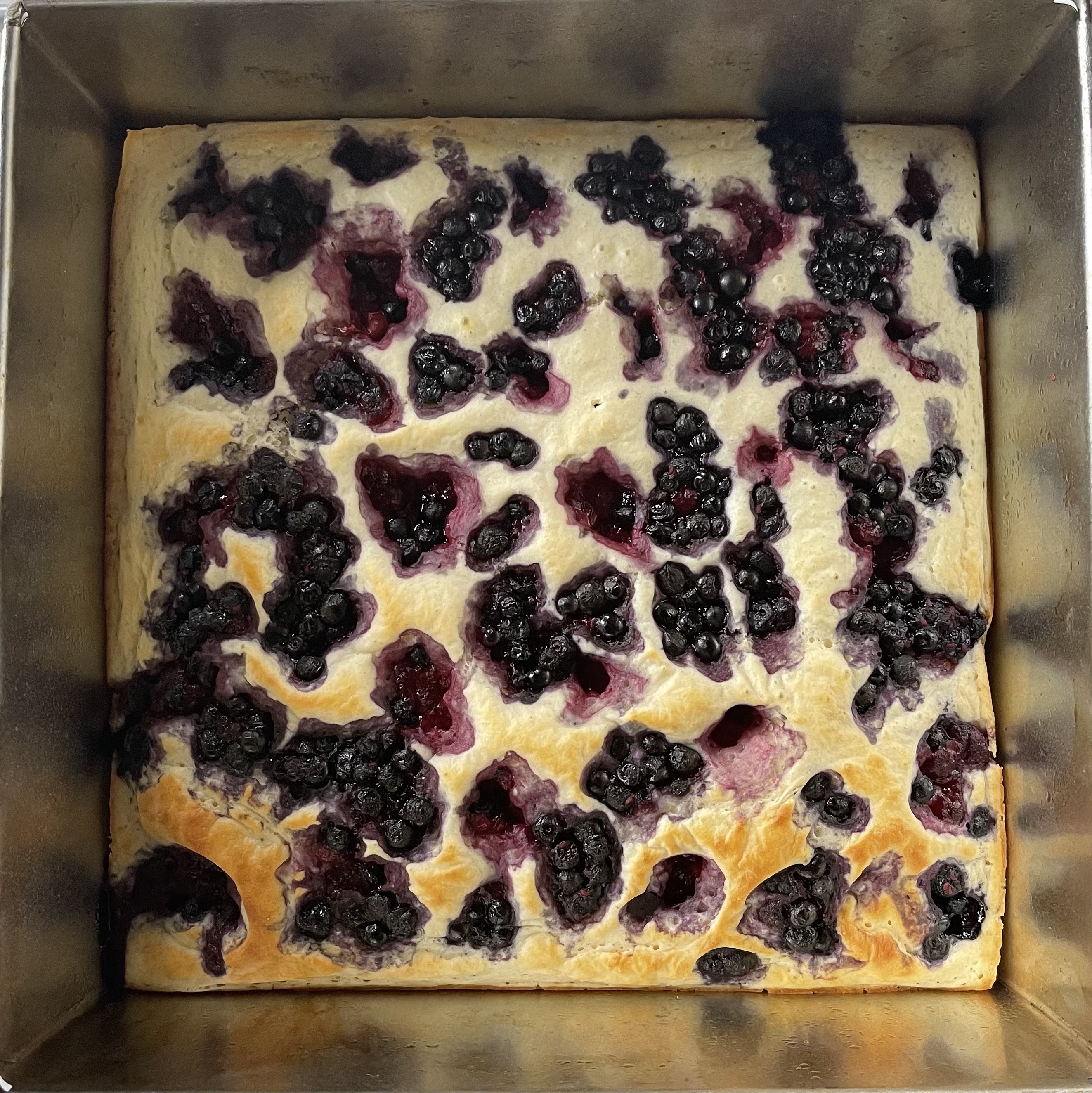 Nodig: 1 pak mix voor American Pancakes + 350 ml karnemelk + 250 g fruitmix framboos blauwe bes + vierkant bakblik/bakplaat
