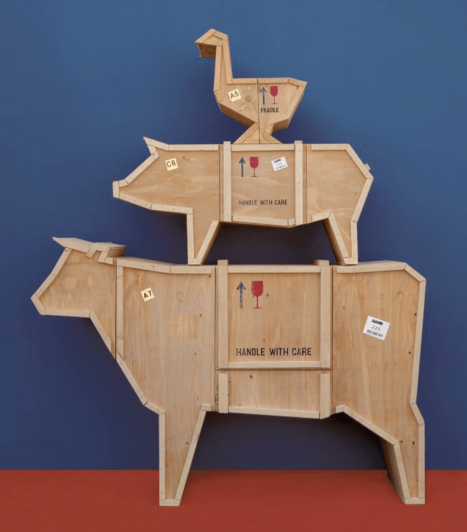 Verzendkisten in de vorm van een koe, varken of gans. Shaped Furniture met Sending Cow, Sending Pig en Sending Goose. Alledrie ontworpen als kast met bergruimte tot in de poten. Leuke details: de koe heeft een la met erboven een uitklapbaar werkblaadje en de eend is tevens een -extra- zitplek.