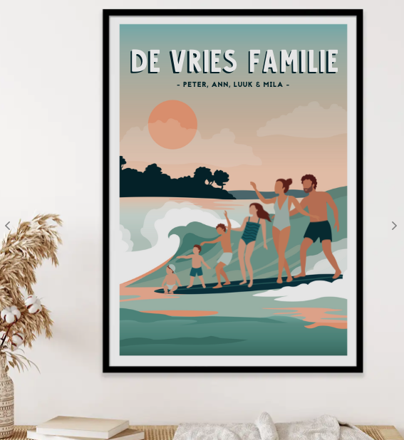 Je kiest het aantal gezinsleden en kan ze naar wens aanpassen; de kleur huid, kleur haar en haarlengte. Maar ook krullen of een baard. Je kiest de familienaam en de voornamen, dan nog het formaat van de poster en tot slot de kleur van de lijst. Top!