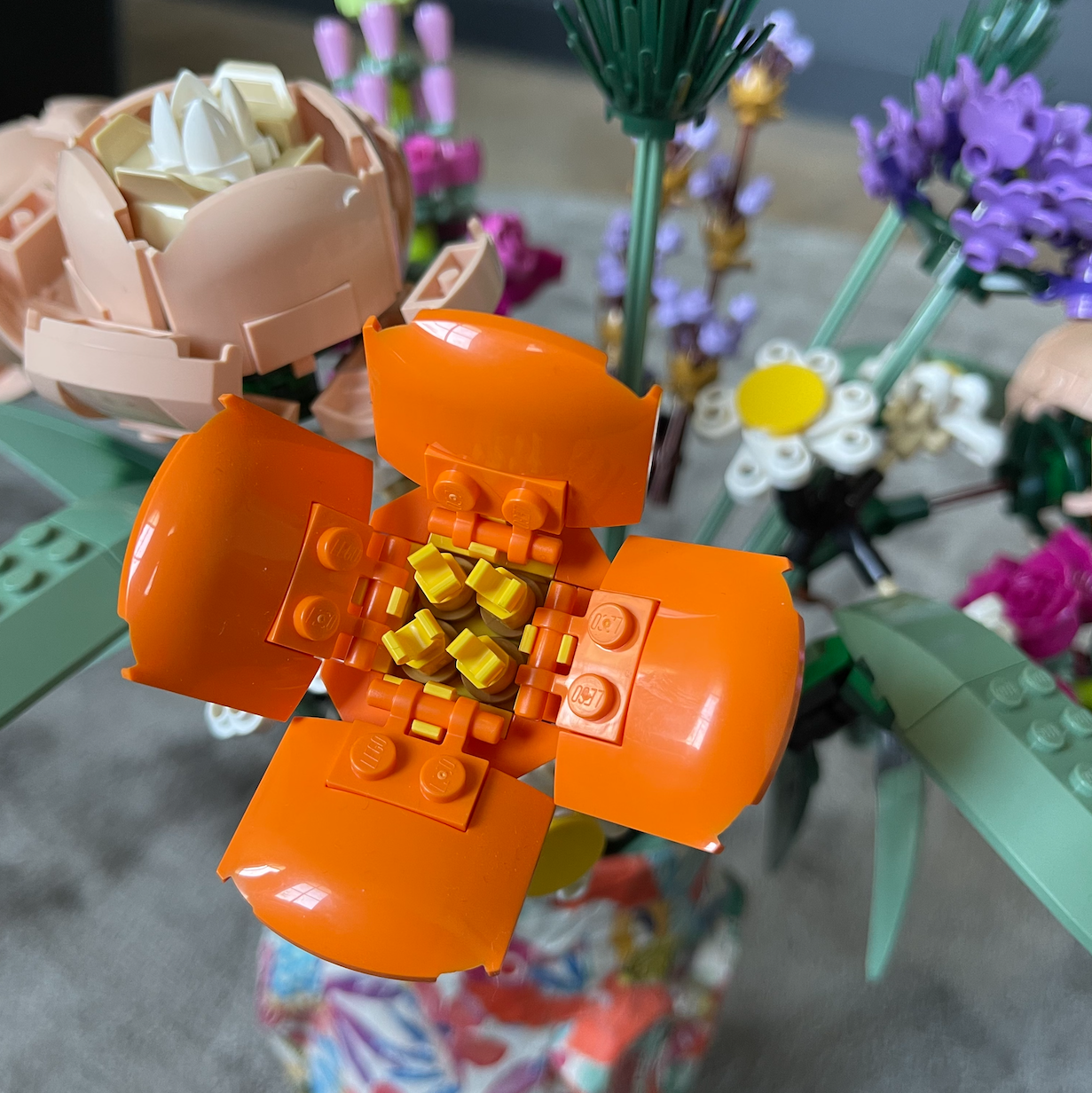 Het boeket op de foto is voluit van de Lego Creator Expert Botanical Collection, bloemenboeket 10280. Leuk.