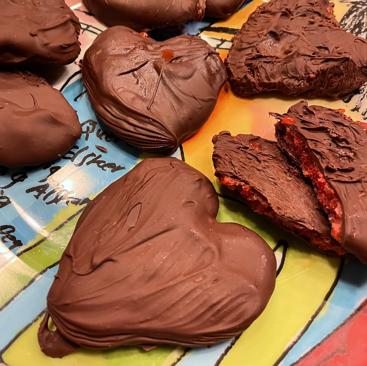 Smelt de chocola au-bain-marie met de roomboter samen. Haal de harten [uit de vriezer] door de chocola, zodat deze rondom bekleed zijn. Leg ze weer op bakpapier. Na het uitharden verpak je ze in een stuk bakpapier vastgeknoopt met een stuk slagerstouw. Dan geef je het als een cadeautje, verrassing! Overheerlijk vonden wij…
