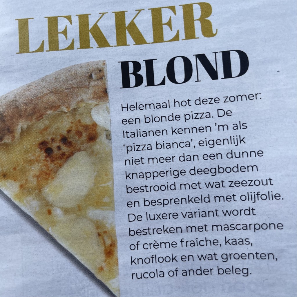 Volgens het recepten-tijdschrift ‘Boodschappen’ is de blonde pizza -de pizza Bianca- helemaal hot deze zomer. Daar wil zeggen, zónder tomatensaus. Proberen!