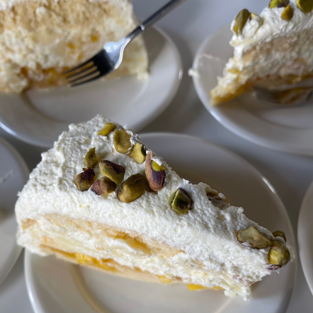 Nodig: 3 eieren + 3 el suiker + zakje vanillesuiker + snuf zout + 125 g bloem + 1/2 tl bakpoeder + 300 ml karnemelk + 1 mango + 1 zakje taartgelei [Taartina] + 350 ml passievruchtensap + 6 blaadjes gelatine + 800 ml slagroom + 2 zakjes slagroomversterker [Klop-fix] + 2 el gehakte pistachenoten [taart, zoet 12 stukken]